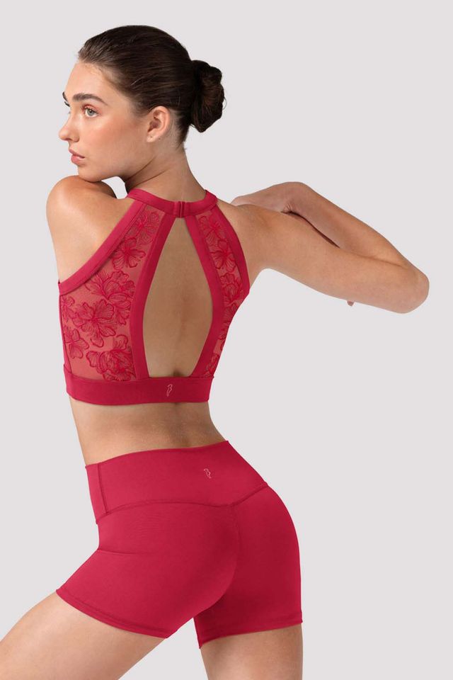 Nasz damski top Nina Floral Crop Top ma elegancki wysoki kołnierz z zapięciem na klips z tyłu oraz efektowne odkryte plecy z misternie haftowanymi panelami z siateczki. Delikatny kwiatowy haft rozkwita na każdej sylwetce, a szwy inspirowane gorsetem dodają romantycznego akcentu Twojej garderobie tanecznej. Nasza kolekcja Camellia łączy ponadczasowe piękno z techniczną precyzją - inspirując pewność siebie w każdym ruchu, od studia po scenę.