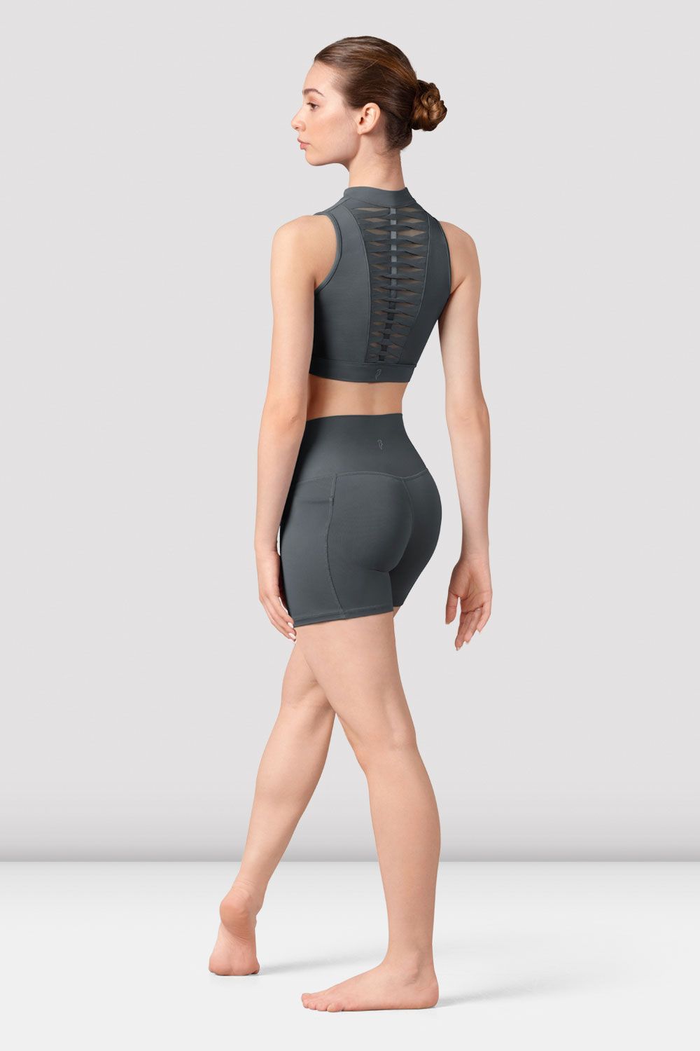 Our Ladies Alix Zip Front Crop Top features a sophisticated high neck with a zip front closure and a soft mesh twist back detail. Pair with our Harrieta V Front Shorts or Beau Full Length Leggings for your perfect dancewear look.